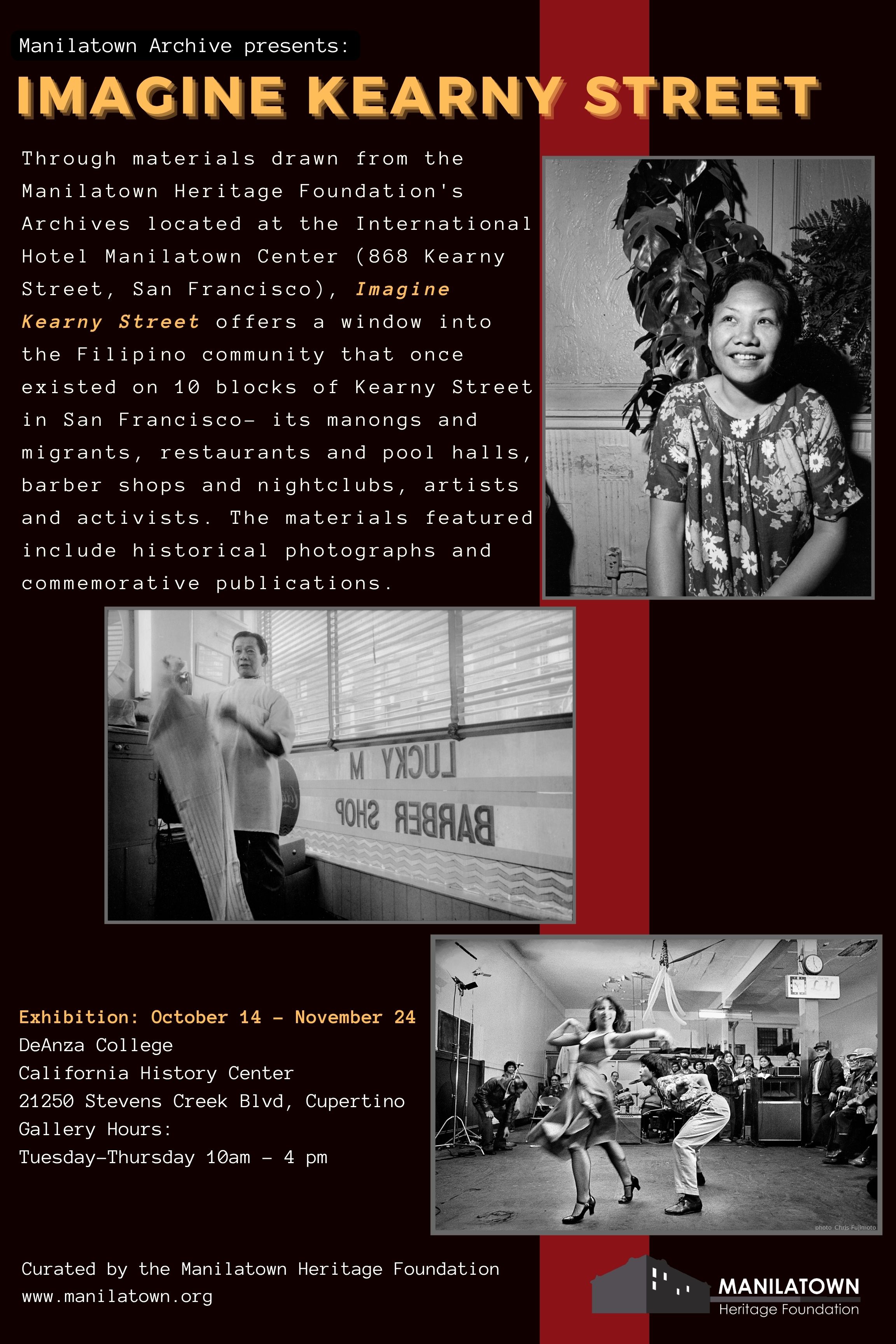 Through materials drawn from the Manilatown Heritage Foundation's Archives located at the International Hotel Manilatown Center (868 Kearny Street, San Francisco), "Imagine Kearny Street", offers a window into the Filipino community that once existed on 10-blocks of Kearny Street in San Francisco - its manongs and migrants, restaurants and pool halls, barber shops and nightclubs, artists and activists. The materials featured include historical photographs and commemorative publications.